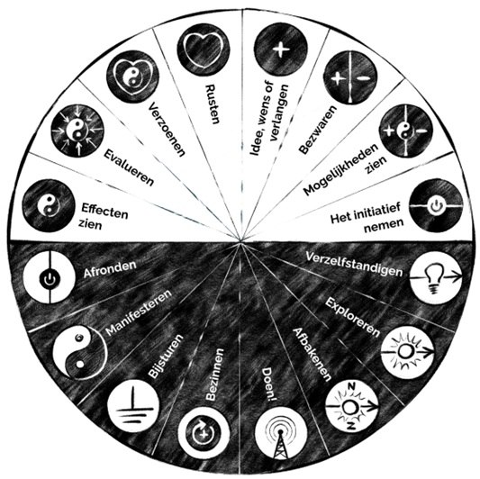 In onderstaande figuur heb ik deze zestien fasen voor organisch creëren schematisch weergegeven.
