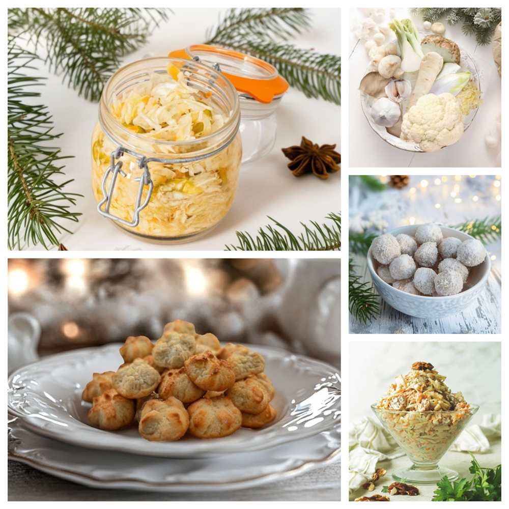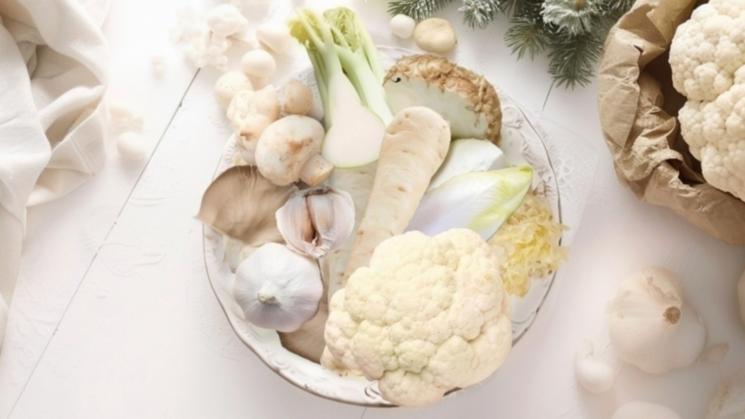Een greep uit de overvloed aan witte voeding voor mijn kerstmenu: witte kool, zuurkool, Chinese kool, spitskool, witlof, bloemkool, schorseneer, knolselderij, yacon, pastinaak, wit van prei, aardappel, aardpeer, ui, koolrabi, daikon, witte zoete bataat, witte kiemen, venkel, oesterzwammen, peterseliewortel, appel, peer, witte moerbei, witte druiven, banaan.